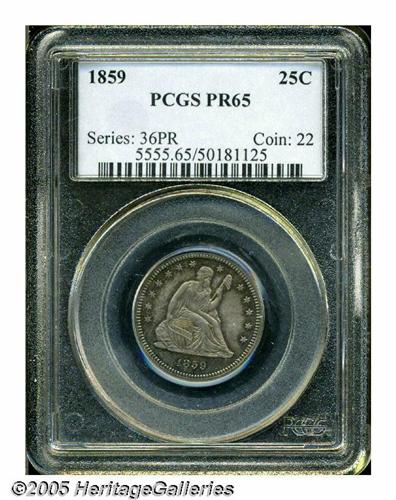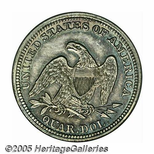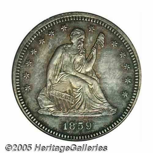 <B>1859<25C> PR65 PCGS.</B></I> A subtly reflective Gem with a base of steel-violet toning and multicolored accents that enliven each side. Although Mint records indicate that 800 proofs were struck in this year, an unknown number were melted at year's end as unsold, leaving this issue with a relatively high official mintage but low availability in all grades. Population: 8 in 65, 7 finer (5/05).