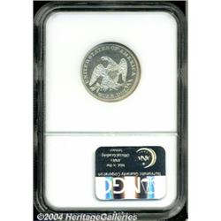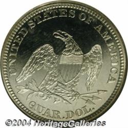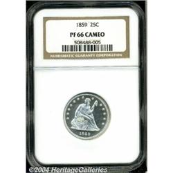 <B>1859<25C> PR66 Cameo NGC.</B></I> Breen-4019, Briggs-2C. Type One obverse, Type Two reverse. Three die scratches from the tip of the rock toward star 1 are clearly visible. On the reverse, recutting of QUAR. DOL. is also plain. Just 800 proof quarter dollars were struck in 1859, according to conventional wisdom. The number of these actually distributed is not precisely known. The net distribution was certainly very small, given the elusive nature of this issue. The devices of this Gem proof are highly lustrous with white silvery frosty. These design elements contrast nicely with the deeply mirrored fields to provide a stunning visual effect. A small lintmark in the field just right of, and slightly below, Liberty's knee resembles a backward question mark, and will serve as a pedigree marker for future researchers. All design features are boldly defined and are surrounded by wavy fields, typical of most proof coins from this era. Population: 8 in 66, 1 finer (7/04). <BR><BR><B>Important notice:</B> Heritage usually auctions material at the rate of 200-250 lots per hour. On some occasions eBay Live bid software or the Internet may not be able to keep up with the pace of the auction. We recommend placing a realistic absentee bid now as insurance to avoid disappointment. Occasionally the auctioneer may eliminate or reject an eBay Live bid, and the auctioneer may also reopen a lot after the close of the eBay live bidding (usually because we missed an audience bid), and may reject your bid even if it shows you as the winning bidder. By bidding via eBay Live, you agree that Heritage may award the lot to another bidder at its sole discretion under the circumstances described above or any other reasonable circumstances. Since eBay bids are not shown to us until we open the lot on the floor, we treat those bids just like floor bids. In most cases the floor responds before the eBay bid is presented to us, due to Internet lag time, so for consistency we have made it a policy that floor bids are always considered first over tie eBay live bids. Also please note that all Heritage lots purchased through eBay Live carry a 20% Buyer's Premium. Please make sure you read the Terms and Conditions before you bid. </span></font></tr></table></td></tr></table>