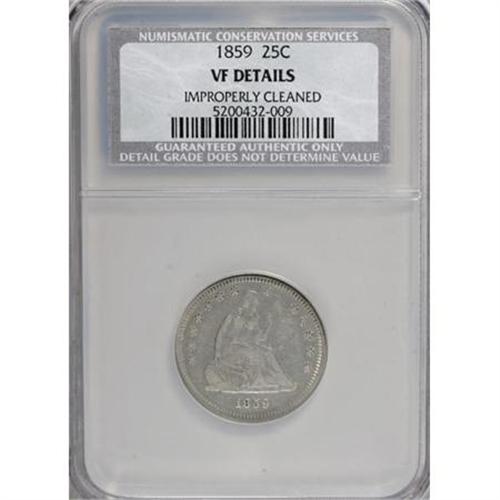 <B>1859 25C --Improperly Cleaned--NCS. VF Details.</B></I> NGC Census: (0/0). PCGS Population (0/0). Mintage: 1,344,000. (#5448)<BR><BR><B>Coin Engraver:</B> Christian Gobrecht<BR><BR><b>Shipping:</b> Coins & Currency (<a target="_blank" href="http://www.heritageauctions.com/common/shipping.php">view shipping information</a>)
