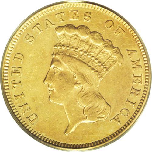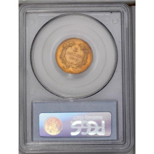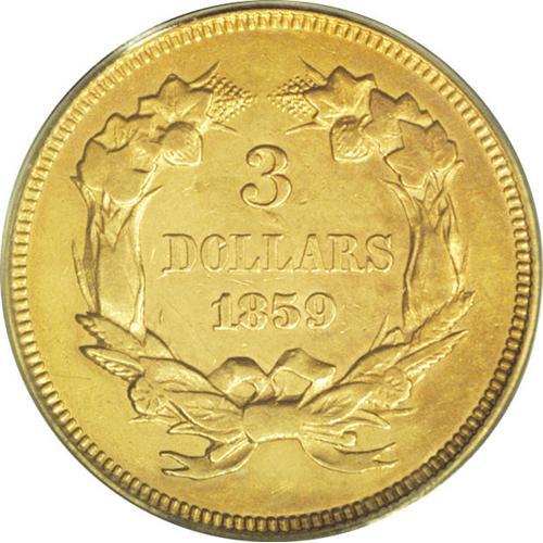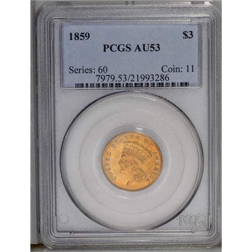 <B>1859<$3> AU53 PCGS.</B></I> A peach-gold example of this popular low mintage date. Luster emerges from recessed areas, and highpoint wear is moderate. Struck from clashed and slightly rotated dies.