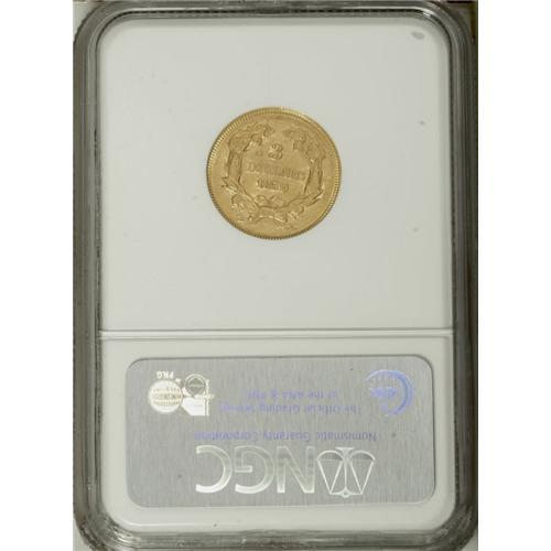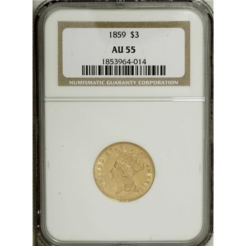 <B>1859 $3 AU55 NGC.</B></I> A smooth example that retains a goodly portion of its original luster. The 1859 has a much lower mintage than the 1854, yet trades for only slightly higher prices. Struck from mildly clashed dies.<BR><BR><b>Shipping:</b> Coins & Currency (<a target="_blank" href="http://www.heritageauctions.com/common/shipping.php">view shipping information</a>)
