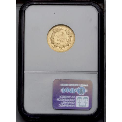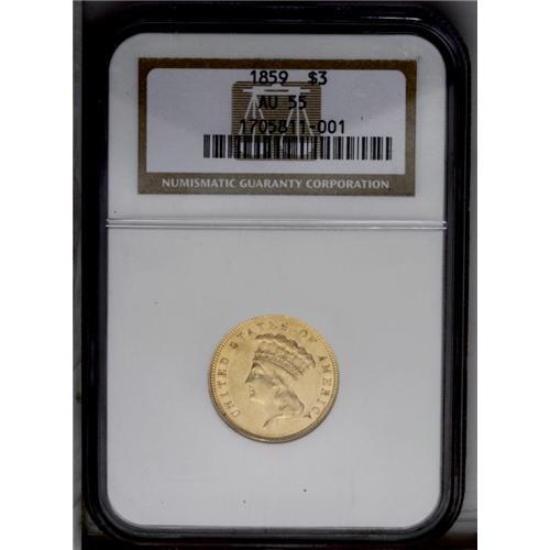 <B>1859<$3> AU55 NGC.</B></I> This attractive Choice AU example displays typical highpoint wear over Liberty's hair detail, for the grade, and a substantial degree of semi-prooflikeness in the fields. There are no mentionable abrasions on either side, only faint hairlines. One of the scarcest P-mint issues from the 1850s.<BR><I>From The Steve Glenn Collection.</B></I> <BR><BR><B>Important notice:</B> Heritage usually auctions material at the rate of 200-250 lots per hour. On some occasions eBay Live bid software or the Internet may not be able to keep up with the pace of the auction. We recommend placing a realistic absentee bid now as insurance to avoid disappointment. Occasionally the auctioneer may eliminate or reject an eBay Live bid, and the auctioneer may also reopen a lot after the close of the eBay live bidding (usually because we missed an audience bid), and may reject your bid even if it shows you as the winning bidder. By bidding via eBay Live, you agree that Heritage may award the lot to another bidder at its sole discretion under the circumstances described above or any other reasonable circumstances. Since eBay bids are not shown to us until we open the lot on the floor, we treat those bids just like floor bids. In most cases the floor responds before the eBay bid is presented to us, due to Internet lag time, so for consistency we have made it a policy that floor bids are always considered first over tie eBay live bids. Also please note that all Heritage lots purchased through eBay Live carry a 20% Buyer's Premium. Please make sure you read the Terms and Conditions before you bid. This lot is being auctioned in conjunction with a live floor auction by Heritage Galleries & Auctioneers. All final auction and invoice information will be supplied by Heritage Galleries & Auctioneers, and all other information should be considered preliminary. Lot:2575 <BR><BR><B>Winning Notification and Billing:</B> After the FINAL session in this auction is complete, Heritage will send e-mail and snail mail invoices. This process normally takes several days. All final auction and invoice information will be supplied by Heritage Galleries & Auctioneers, and all other information should be considered preliminary. <BR><BR>This auction will be conducted on a live auction floor and over the Internet through eBay Live. If you choose to place an absentee bid, please take a moment to <font color='#0000ff'><u><a href='http://pages.ebay.com/liveauctions/help/before/laabsentee.html'>learn how eBay Live absentee bidding works</a></u></font><font color='#000000'>