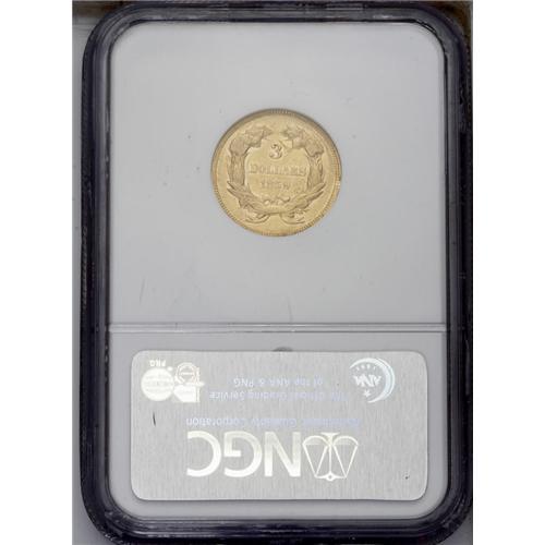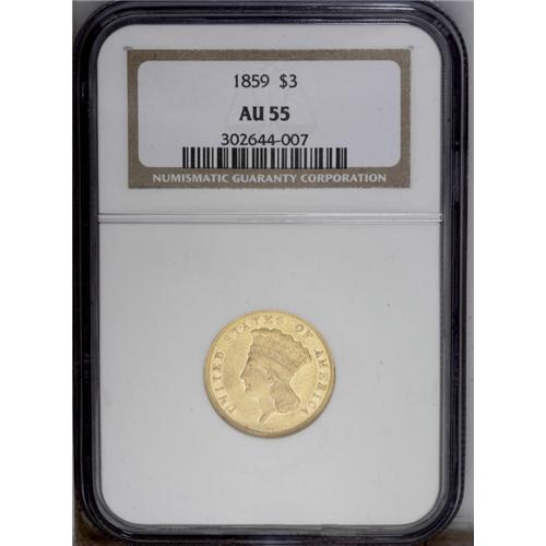 <B>1859 $3 AU55 NGC.</B></I> This appealing Choice AU survivor is lustrous and has a smooth, unmarked obverse. Light highpoint wear seems typical for the grade, and a single moderate abrasion is seen below OLL and just above the date, on the reverse.