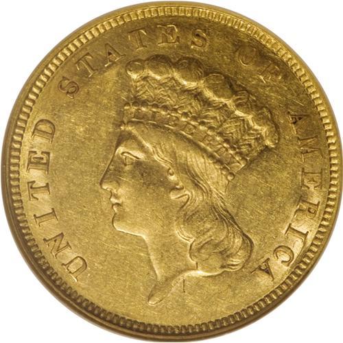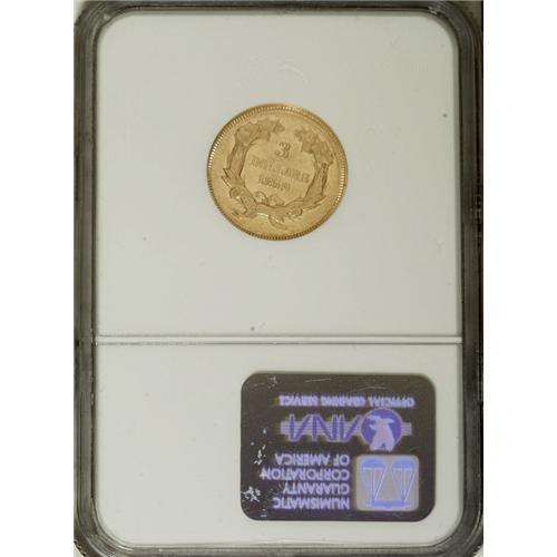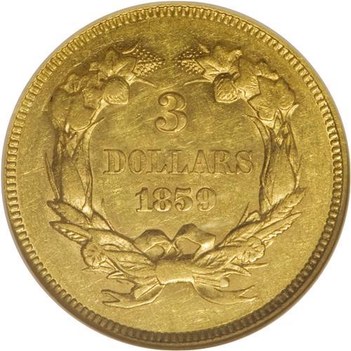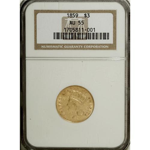 <B>1859 $3 AU55 NGC.</B></I> This attractive Choice AU example displays typical highpoint wear over Liberty's hair detail, for the grade, and a substantial degree of semi-prooflikeness in the fields. There are no mentionable abrasions on either side, only faint hairlines. One of the scarcest P-mint issues from the 1850s.<BR><BR><b>Shipping:</b> Coins & Currency (<a target="_blank" href="http://www.heritageauctions.com/common/shipping.php">view shipping information</a>)