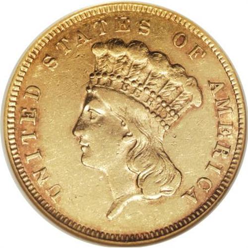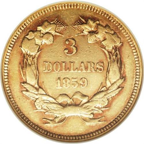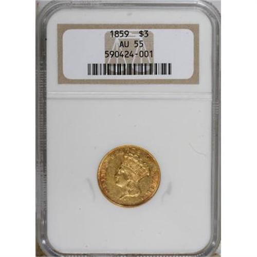 <B>1859 $3 AU55 NGC.</B></I> The present AU55 piece boasts canary-yellow centers that deepen to auburn at the obverse rims and the protected areas on the reverse. Singular distractions are nil, and a goodly portion of the original mint luster is expectedly still present. <BR><BR><b>Shipping:</b> Coins & Currency (<a target="_blank" href="http://www.heritageauctions.com/common/shipping.php">view shipping information</a>)