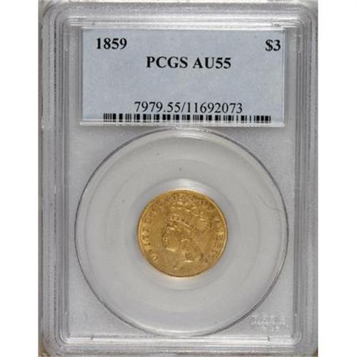 <B>1859 $3 AU55 PCGS.</B></I> Hints of subtle luster grace the margins of this lightly circulated mustard-gold example. A well struck and minimally marked piece, one of just 15,500 coins minted.<BR><BR><b>Shipping:</b> Coins & Currency (<a target="_blank" href="http://www.heritageauctions.com/common/shipping.php">view shipping information</a>)