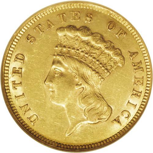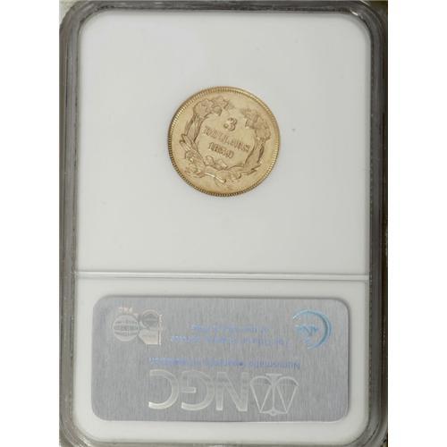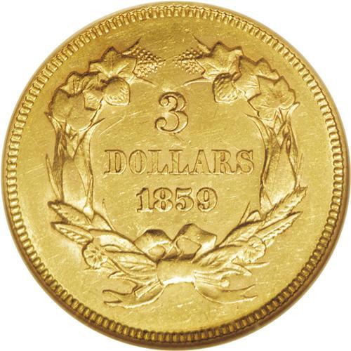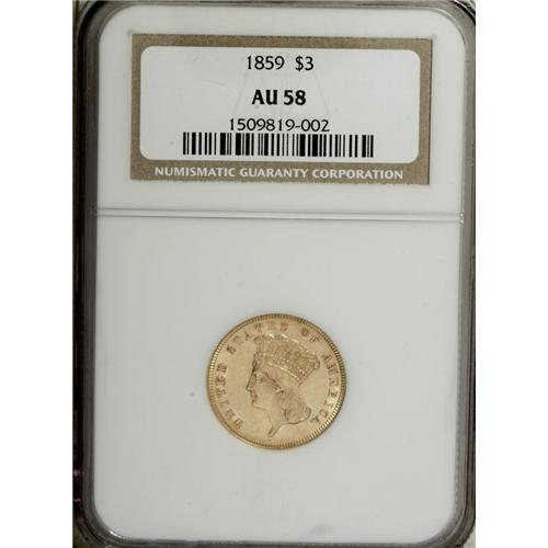 <B>1859 $3 AU58 NGC.</B></I> Another near-Mint State three dollar gold piece from the early years of this popular series, the present example boasts light yellow-gold surfaces that deepen to golden-orange near the rims. Excellent luster and a paucity of mentionable abrasions are hallmarks. Light clash marks are seen on each side under a lens.<BR><BR><b>Shipping:</b> Coin/Currency (<a target="_blank" href="http://www.heritageauctions.com/common/shipping.php">view shipping information</a>)