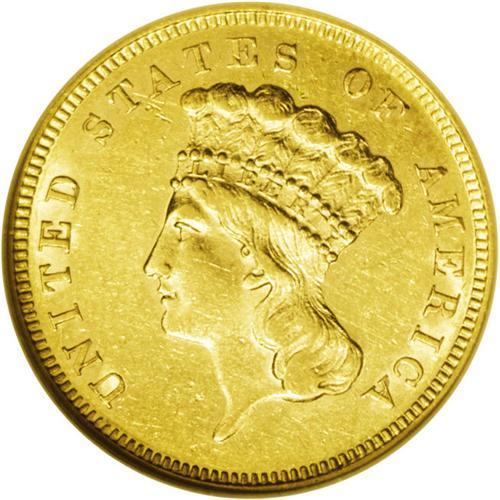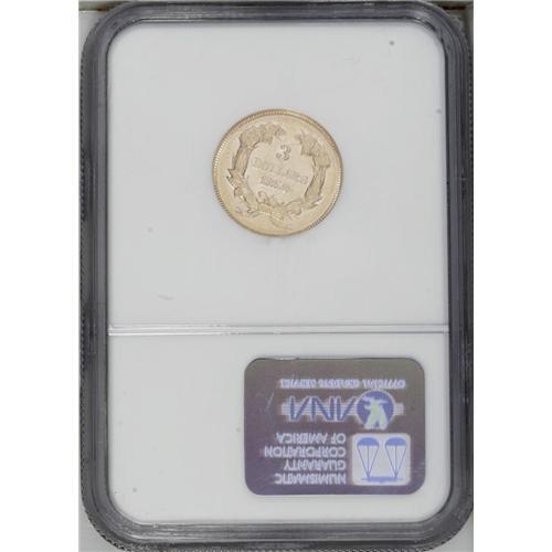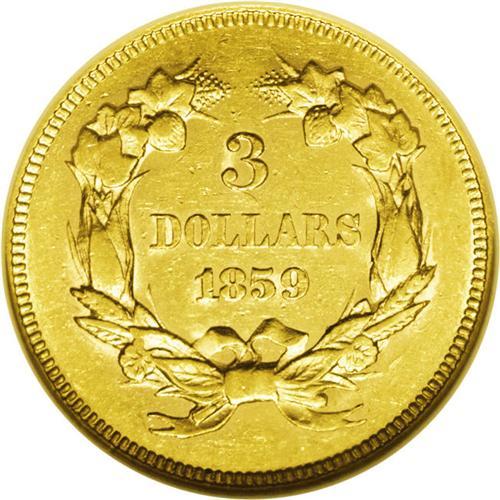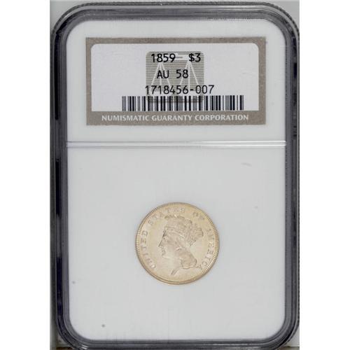 1859 $3 AU58 NGC. With only 15,558 pieces struck, the