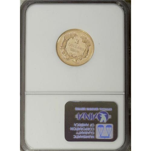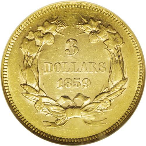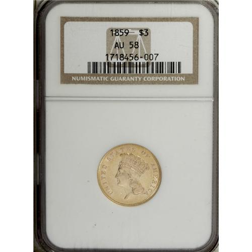 1859 $3 AU58 NGC. With only 15,558 pieces struck, the