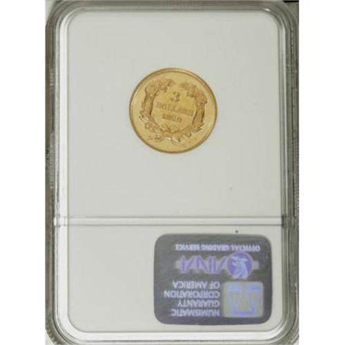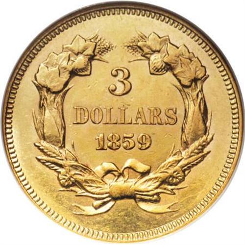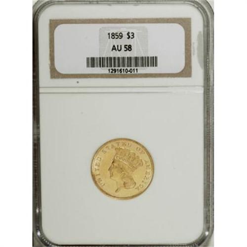 <B>1859 $3 AU58 NGC.</B></I> Aside from a single small mark on Liberty's cheek, this near-Mint specimen has exceptional surfaces for the grade. Both sides have nearly full luster with lovely light yellow color. As a date, the 1859 is considered scarce, although it is certainly not a rarity, and quite a number of Mint State pieces exist. As with many issues in this series, the AU58 grade level certainly provides a good value, combining excellent quality with an affordable price.<BR><I>From The DAX Collection.</B></I><BR><BR><B>Coin Engraver:</B> James B. Longacre<BR><BR><b>Shipping:</b> Coins & Currency (<a target="_blank" href="http://www.heritageauctions.com/common/shipping.php">view shipping information</a>\)