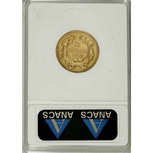 <B>1859 $3 --Bent, Cleaned, Scratched--ANACS. XF45 Details.</B></I> NGC Census: (18/364). PCGS Population (23/241). Mintage: 15,500. Numismedia Wsl. Price for NGC/PCGS coin in XF45: $1,131. (#7979)<BR><BR><b>Shipping:</b> Coins & Currency (<a target="_blank" href="http://www.heritageauctions.com/common/shipping.php">view shipping information</a>)