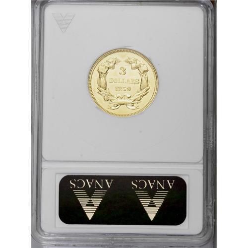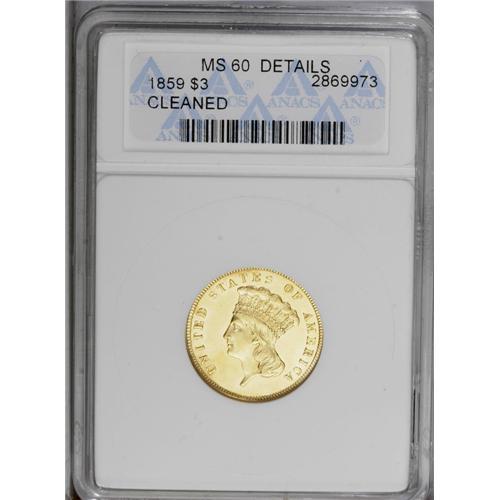 <B>1859<$3>--Cleaned--ANACS. MS60 Details.</B></I> A yellow-gold coin, unnaturally bright with light hairlines from cleaning. The surfaces retain traces of the original luster and a faint cameo effect persists.
