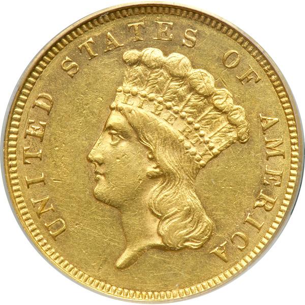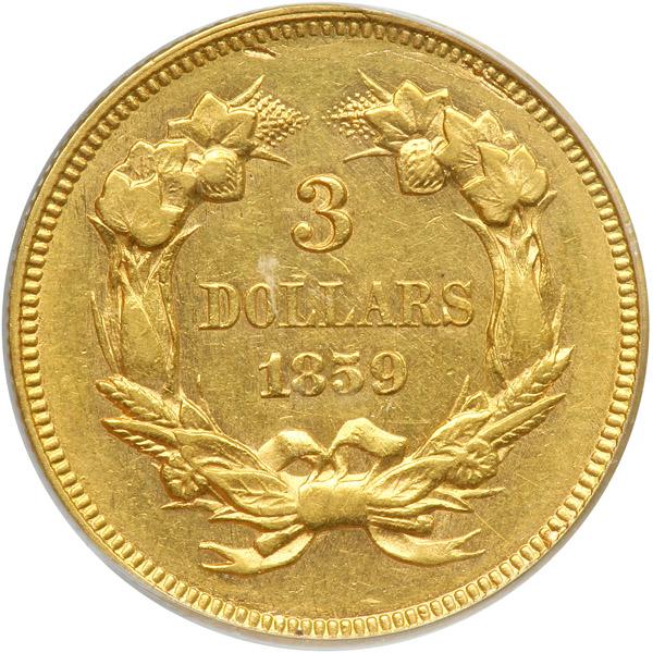 1859. PCGS graded AU-55. Well struck and basically, untoned. Quite lustrous and choice for the grade. Only 15,558 were struck (PCGS # 7979) .
