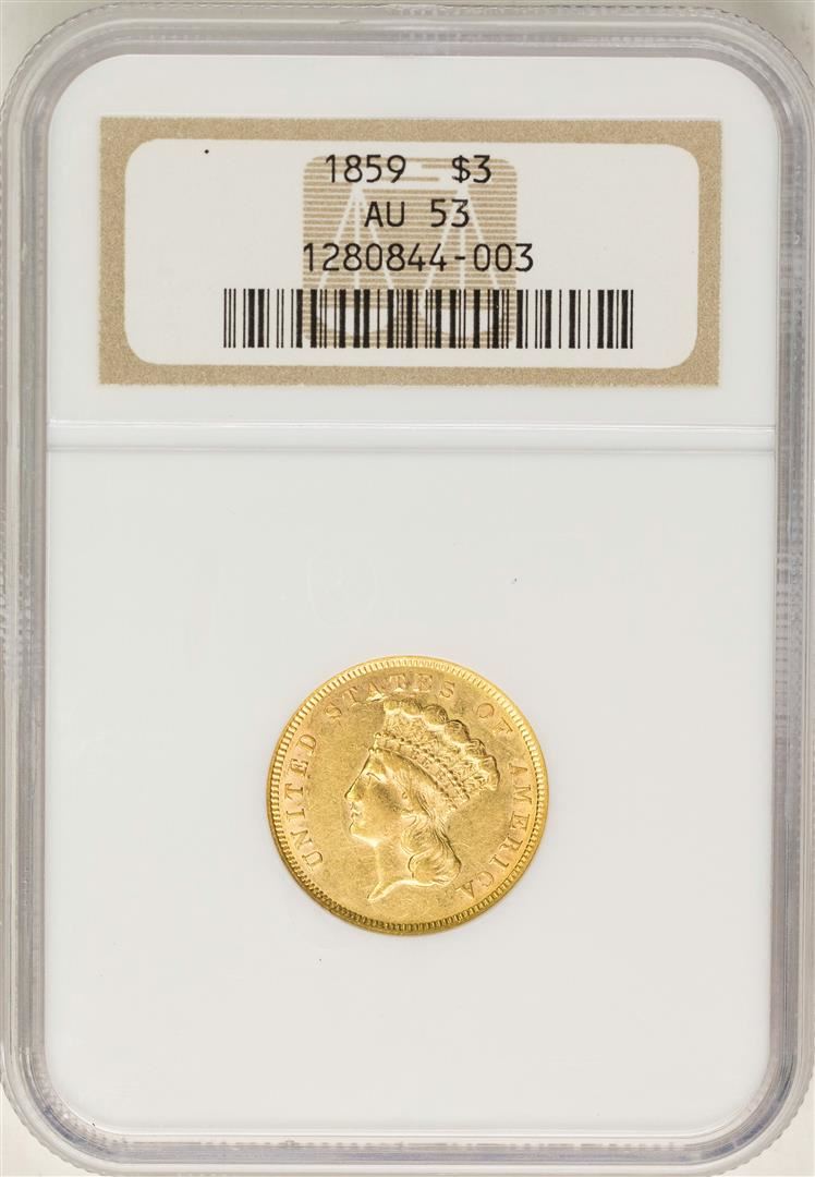 One 1859 $3 Indian Princess Head Gold Coin NGC AU53. NGC Certified.