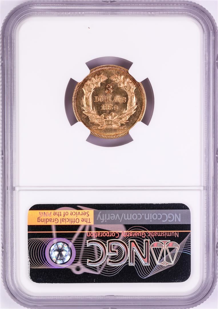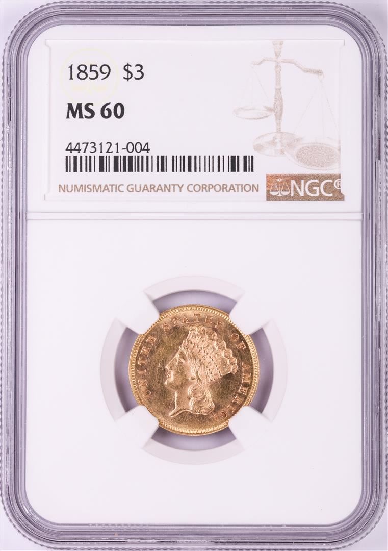 One 1859 $3 Indian Princess Head Gold Coin NGC MS60. NGC Certified.