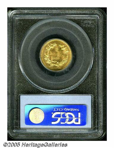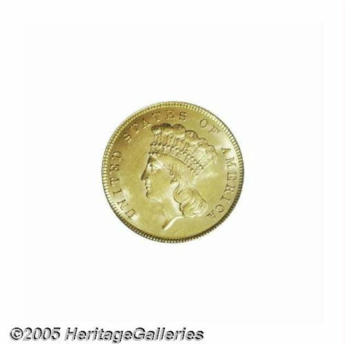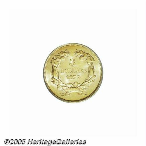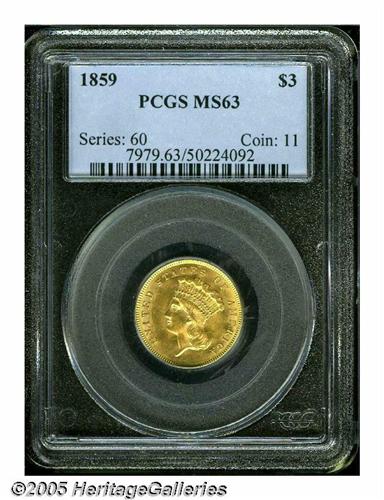 <B>1859<$3> MS63 PCGS.</B></I> Sharply struck on a golden-yellow planchet. Both sides show die clash marks (as struck) which are not abrasions on the coin. This is an impressive, highly lustrous, untoned example which is sure to excite the specialist. Only 15,558 pieces were struck. Population: 19 in 63, 14 finer (6/05).