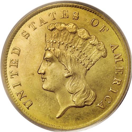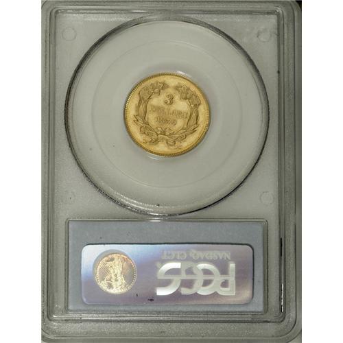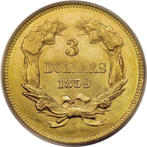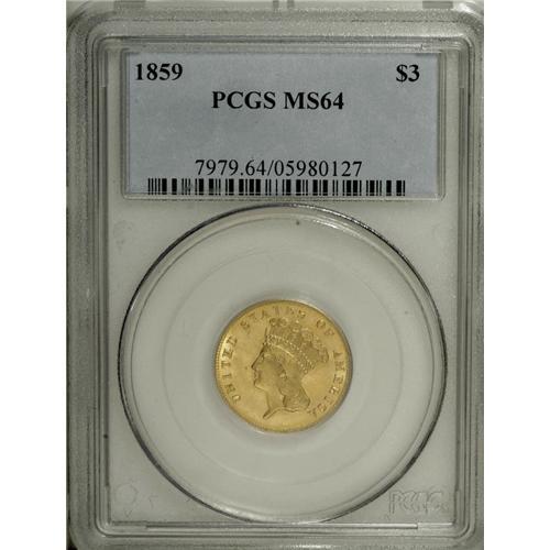<B>1859 $3 MS64 PCGS.</B></I> Surviving 1859 three dollar gold pieces are well distributed throughout the grading spectrum, from VG8 to MS67. Better grade Uncirculated pieces are somewhat elusive. They may also be weakly struck on the 8 and 5 of the date and on the wreath bow. The near-Gem presented in this lot is well defined in these areas, as well as on the remaining design elements. Glowing luster adorns yellow-gold surfaces that are accented with wisps of orange and light green. Light die striations are evident in the fields, indicating an earlier strike, and both sides are well preserved. Population: 13 in 64, 7 finer (4/07).<BR><BR><b>Shipping:</b> Coins & Currency (<a target="_blank" href="http://www.heritageauctions.com/common/shipping.php">view shipping information</a>)