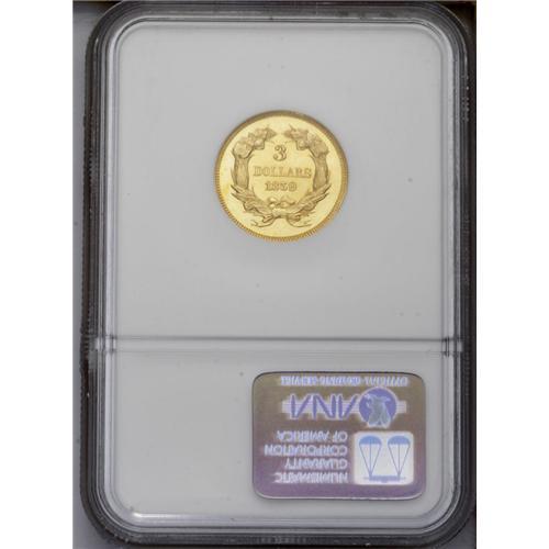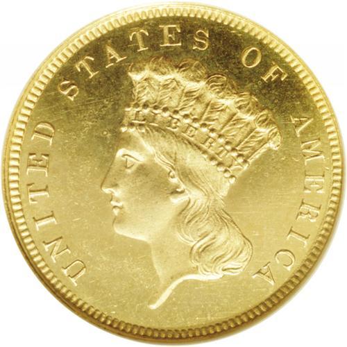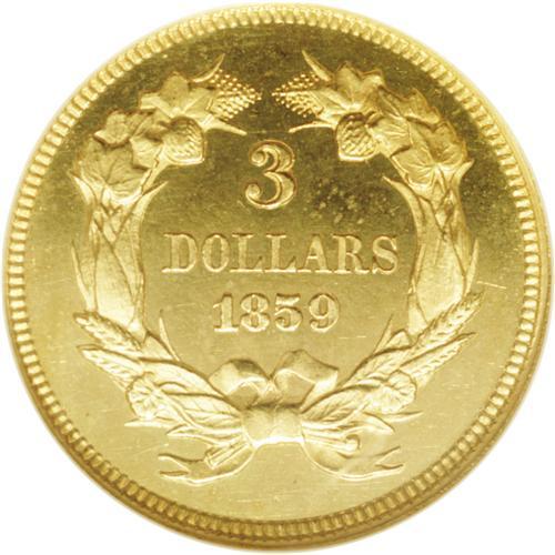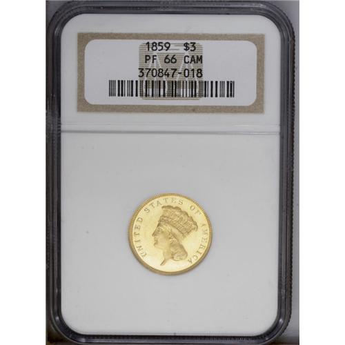 <B>1859<$3> PR66 Cameo NGC.</B></I> A common theme among the early proof gold coins, from the 1850s and 1860s, is a surviving population of about 10 to 12 coins. As a rule, survival rates are lower for the larger denomination coins. It was an simpler financial decision to keep small denomination proofs and spend larger denomination proofs when money was needed. The mintage of this issue is usually reported as 80 proofs, but it is likely that most were later melted after remaining unsold. Breen has suggested a net mintage of about 35 to 40 coins. In his <I>Complete Encyclopedia,</B></I> he stated: "at least 35 sold at [the] Mint, rest melted." It is difficult to be certain how many of those coins survive today, although 10 or 12 examples seems likely.<BR> The outer right curve of the digit 9 is slightly recut, a characteristic of the die that was used to produce proofs and business strikes alike. This is an amazing Gem proof with exceptional cameo contrast. The fields are deeply mirrored in rich greenish-gold, with highly lustrous and frosty devices. As expected, every design element is boldly detailed. The surfaces have a few typical planchet flakes leftover from the minting process. A tiny curved lint mark can be seen below the right base of M in AMERICA, with a small flake below this, and another near the upper left serif of the adjacent E. These are the only convenient pedigree markers, and are generally not visible in older catalog photos.<BR><I>From The Larj Collection.</B></I>