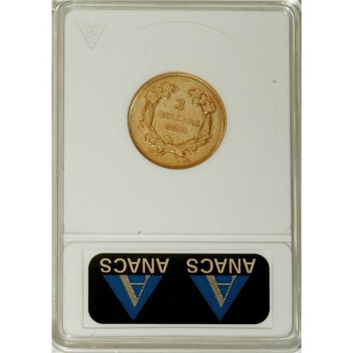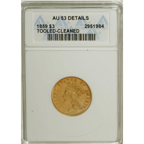 <B>1859 $3 --Tooled, Cleaned--ANACS. AU53 Details.</B></I> Small clusters of pinscratches are located on the bust tip and the reverse field at 12 o'clock, and the pumpkin-gold surfaces are lightly hairlined. Considerable luster remains. A scant 15,558 pieces were struck. Purchased by Karl Stecher Sr. in December 1935 for $6.25 from E.K. Washburn.<BR><I>From The Stecher Collection, Part Two.</B></I><BR><BR><b>Shipping:</b> Coins & Currency (<a target="_blank" href="http://www.heritageauctions.com/common/shipping.php">view shipping information</a>)