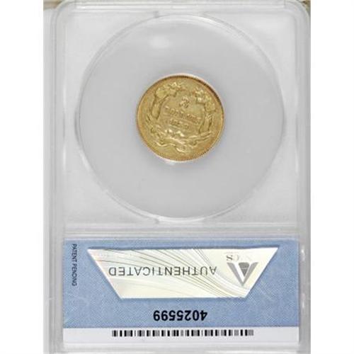 <B>1859 $3 --Repunched Date, Cleaned--ANACS. XF Details.</B></I> The 9 in the date is indeed repunched, probably a characteristic of the entire business strike emission of 15,558 pieces. This circulated example displays suspicious aqua and peach tints once it is rotated beneath a light, but there are no consequential marks.<BR><BR><B>Coin Engraver:</B> James B. Longacre<BR><BR><b>Shipping:</b> Coins & Currency (<a target="_blank" href="http://www.heritageauctions.com/common/shipping.php">view shipping information</a>)
