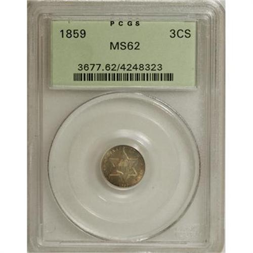 <B>1859 3CS MS62 PCGS.</B></I> PCGS Population (41/172). NGC Census: (23/187). Mintage: 364,200. Numismedia Wsl. Price for NGC/PCGS coin in MS62: $171. (#3677)<BR><BR><B>Coin Engraver:</B> James B. Longacre<BR><BR><b>Shipping:</b> Coins & Currency (<a target="_blank" href="http://www.heritageauctions.com/common/shipping.php">view shipping information</a>)