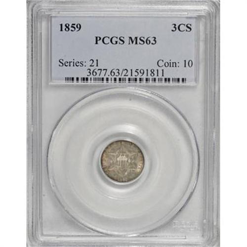 <B>1859 3CS MS63 PCGS.</B></I> PCGS Population (71/101). NGC Census: (52/135). Mintage: 364,200. Numismedia Wsl. Price for NGC/PCGS coin in MS63: $242. (#3677)<BR><BR><B>Coin Engraver:</B> James B. Longacre<BR><BR><b>Shipping:</b> Coins & Currency (<a target="_blank" href="http://www.heritageauctions.com/common/shipping.php">view shipping information</a>)