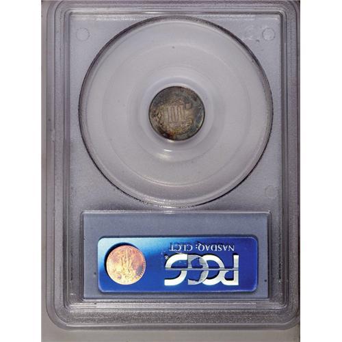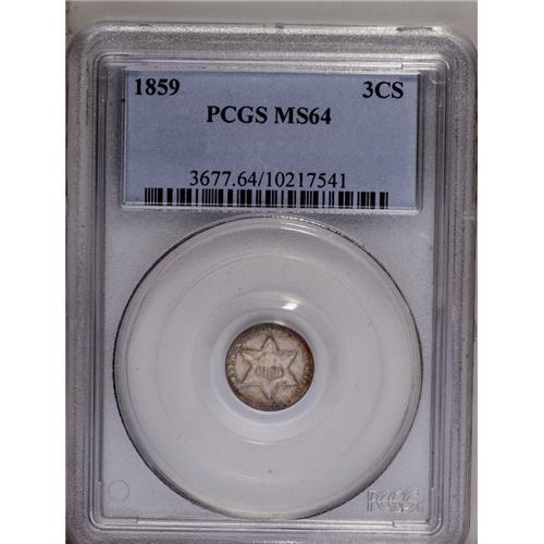 <B>1859<3CS> MS64 PCGS.</B></I> Medium intensity multicolored toning is mostly confined to the border of this lustrous near-Gem trime. Typically seen softness is noted in the centers. A linear abrasion on the upper segment of the obverse star limits the grade.