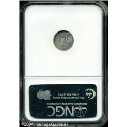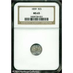 1859 3CS MS65 NGC. Aquamarine and pearl-gray color <B>1859 3CS MS65 NGC.</B></I> Aquamarine and pearl-gray colors embrace this lustrous and exquisitely preserved Gem. The strike is good albeit not needle-sharp. Scarce and underappreciated in all Mint State grades. Population: 22 in 65, 7 finer (10/04). <BR><BR><B>Important notice:</B> Heritage usually auctions material at the rate of 200-250 lots per hour. On some occasions eBay Live bid software or the Internet may not be able to keep up with the pace of the auction. We recommend placing a realistic absentee bid now as insurance to avoid disappointment. Occasionally the auctioneer may eliminate or reject an eBay Live bid, and the auctioneer may also reopen a lot after the close of the eBay live bidding (usually because we missed an audience bid), and may reject your bid even if it shows you as the winning bidder. By bidding via eBay Live, you agree that Heritage may award the lot to another bidder at its sole discretion under the circumstances described above or any other reasonable circumstances. Since eBay bids are not shown to us until we open the lot on the floor, we treat those bids just like floor bids. In most cases the floor responds before the eBay bid is presented to us, due to Internet lag time, so for consistency we have made it a policy that floor bids are always considered first over tie eBay live bids. Also please note that all Heritage lots purchased through eBay Live carry a 20% Buyer's Premium. Please make sure you read the Terms and Conditions before you bid. This lot is being auctioned in conjunction with a live floor auction by Heritage Galleries & Auctioneers. All final auction and invoice information will be supplied by Heritage Galleries & Auctioneers, and all other information should be considered preliminary. Lot:5473