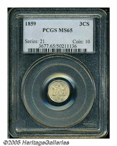 <B>1859<3CS> MS65 PCGS.</B></I> Light honey-gold color graces this unmarked and satiny Gem. Not fully struck, but exceptional from a technical perspective. The first year of the Type Three design. Population: 22 in 65, 7 finer (5/05).