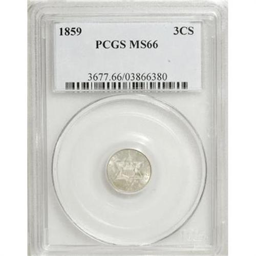 <B>1859 3CS MS66 PCGS.</B></I> Uncommonly well-defined for a pre-Civil War trime issue with lovely luster. Delicate champagne and pink accents visit the margins, while the centers remain satiny and silver-gray. Excellent visual appeal. Population: 11 in 66, 2 finer (12/07).<BR><BR><B>Coin Engraver:</B> James B. Longacre<BR><BR><b>Shipping:</b> Coins & Currency (<a target="_blank" href="http://www.heritageauctions.com/common/shipping.php">view shipping information</a>)