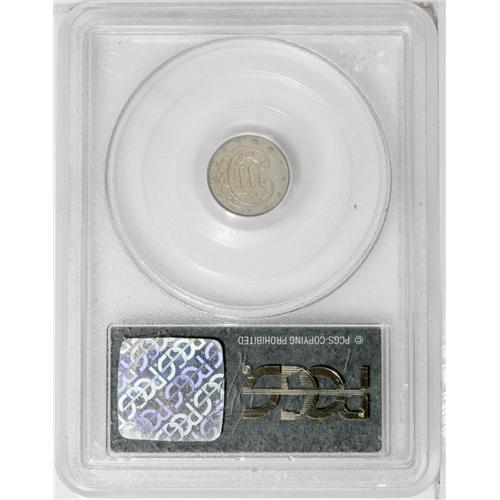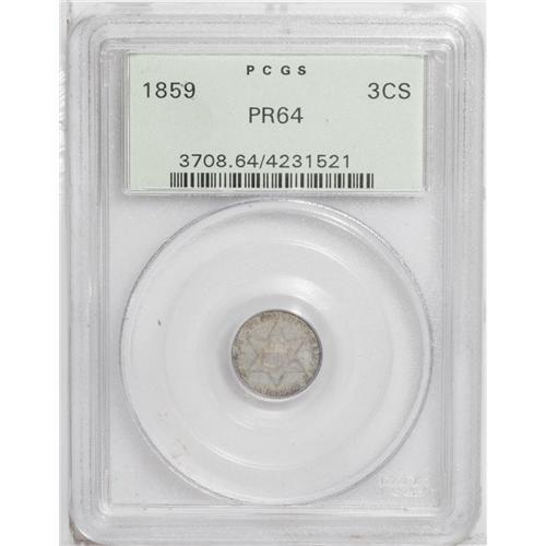 <B>1859<3CS> PR64 PCGS.</B></I> Olive-gold and fuchsia toning covers each side in equal proportion. Clash marks show on the reverse from the obverse shield. Only 800 proofs were coined of this issue, from a time shortly before when the Civil War drove all three cent pieces from circulation, effectively dooming (along with fractional currency) the denomination. Population: 36 in 64, 19 finer (9/06).