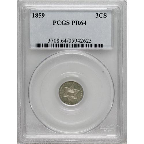 <B>1859 3CS PR64 PCGS.</B></I> This year saw the introduction of the Type Three three cent silver, two lines around the central star and an olive sprig above the III. This brilliant silver-gray survivor from the proof mintage of 800 coins shows some field-device contrast, with scattered light hairlines appearing under a loupe.<BR><BR><b>Shipping:</b> Coins & Currency (<a target="_blank" href="http://www.heritageauctions.com/common/shipping.php">view shipping information</a>)