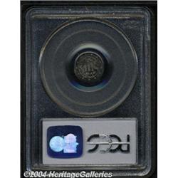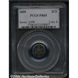 <B>1859<3CS> PR65 PCGS.</B></I> Sensational multicolored toning incorporates rich shades of emerald-green, carmine, and burnt-orange. Faint die clashing can be seen over the watery, mirrored fields, primarily on the reverse. Population: 11 in 65, 7 finer (4/04). <BR><BR><B>Important notice:</B> Heritage usually auctions material at the rate of 200-250 lots per hour. On some occasions eBay Live bid software or the Internet may not be able to keep up with the pace of the auction. We recommend placing a realistic absentee bid now as insurance to avoid disappointment. Occasionally the auctioneer may eliminate or reject an eBay Live bid, and the auctioneer may also reopen a lot after the close of the eBay live bidding (usually because we missed an audience bid), and may reject your bid even if it shows you as the winning bidder. By bidding via eBay Live, you agree that Heritage may award the lot to another bidder at its sole discretion under the circumstances described above or any other reasonable circumstances. Since eBay bids are not shown to us until we open the lot on the floor, we treat those bids just like floor bids. In most cases the floor responds before the eBay bid is presented to us, due to Internet lag time, so for consistency we have made it a policy that floor bids are always considered first over tie eBay live bids. Also please note that all Heritage lots purchased through eBay Live carry a 20% Buyer's Premium. Please make sure you read the Terms and Conditions before you bid.