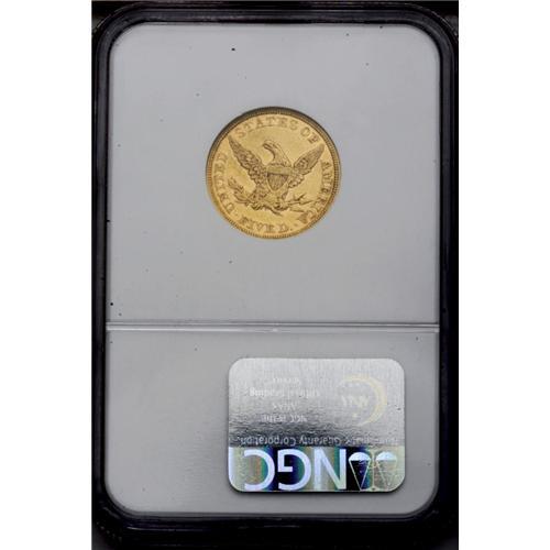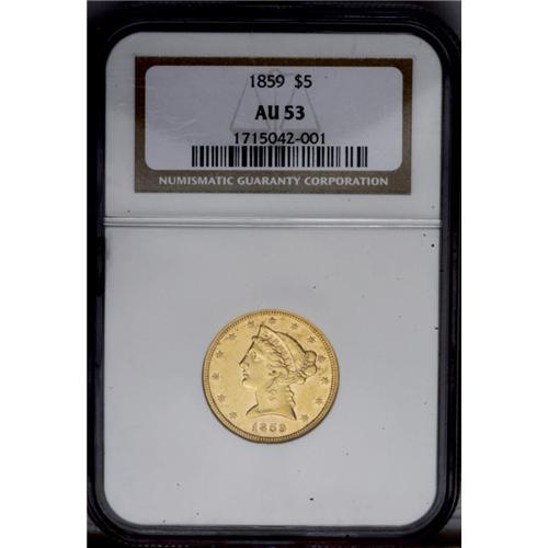 <B>1859<$5> AU53 NGC.</B></I> Despite evidence of brief circulation, the surfaces are prooflike. The remaining detail is well defined and bold, save for slight weakness on the eagle's claws and the arrow feathers nearby.<BR><I>From The Steve Glenn Collection.</B></I> <BR><BR><B>Important notice:</B> Heritage usually auctions material at the rate of 200-250 lots per hour. On some occasions eBay Live bid software or the Internet may not be able to keep up with the pace of the auction. We recommend placing a realistic absentee bid now as insurance to avoid disappointment. Occasionally the auctioneer may eliminate or reject an eBay Live bid, and the auctioneer may also reopen a lot after the close of the eBay live bidding (usually because we missed an audience bid), and may reject your bid even if it shows you as the winning bidder. By bidding via eBay Live, you agree that Heritage may award the lot to another bidder at its sole discretion under the circumstances described above or any other reasonable circumstances. Since eBay bids are not shown to us until we open the lot on the floor, we treat those bids just like floor bids. In most cases the floor responds before the eBay bid is presented to us, due to Internet lag time, so for consistency we have made it a policy that floor bids are always considered first over tie eBay live bids. Also please note that all Heritage lots purchased through eBay Live carry a 20% Buyer's Premium. Please make sure you read the Terms and Conditions before you bid. This lot is being auctioned in conjunction with a live floor auction by Heritage Galleries & Auctioneers. All final auction and invoice information will be supplied by Heritage Galleries & Auctioneers, and all other information should be considered preliminary. Lot:2743 <BR><BR><B>Winning Notification and Billing:</B> After the FINAL session in this auction is complete, Heritage will send e-mail and snail mail invoices. This process normally takes several days. All final auction and invoice information will be supplied by Heritage Galleries & Auctioneers, and all other information should be considered preliminary. <BR><BR>This auction will be conducted on a live auction floor and over the Internet through eBay Live. If you choose to place an absentee bid, please take a moment to <font color='#0000ff'><u><a href='http://pages.ebay.com/liveauctions/help/before/laabsentee.html'>learn how eBay Live absentee bidding works</a></u></font><font color='#000000'>