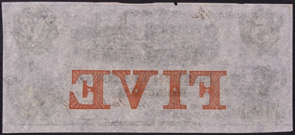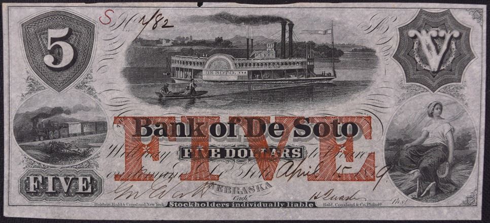 One 1859 $5 Bank of De Soto Obsolete Bank Note.