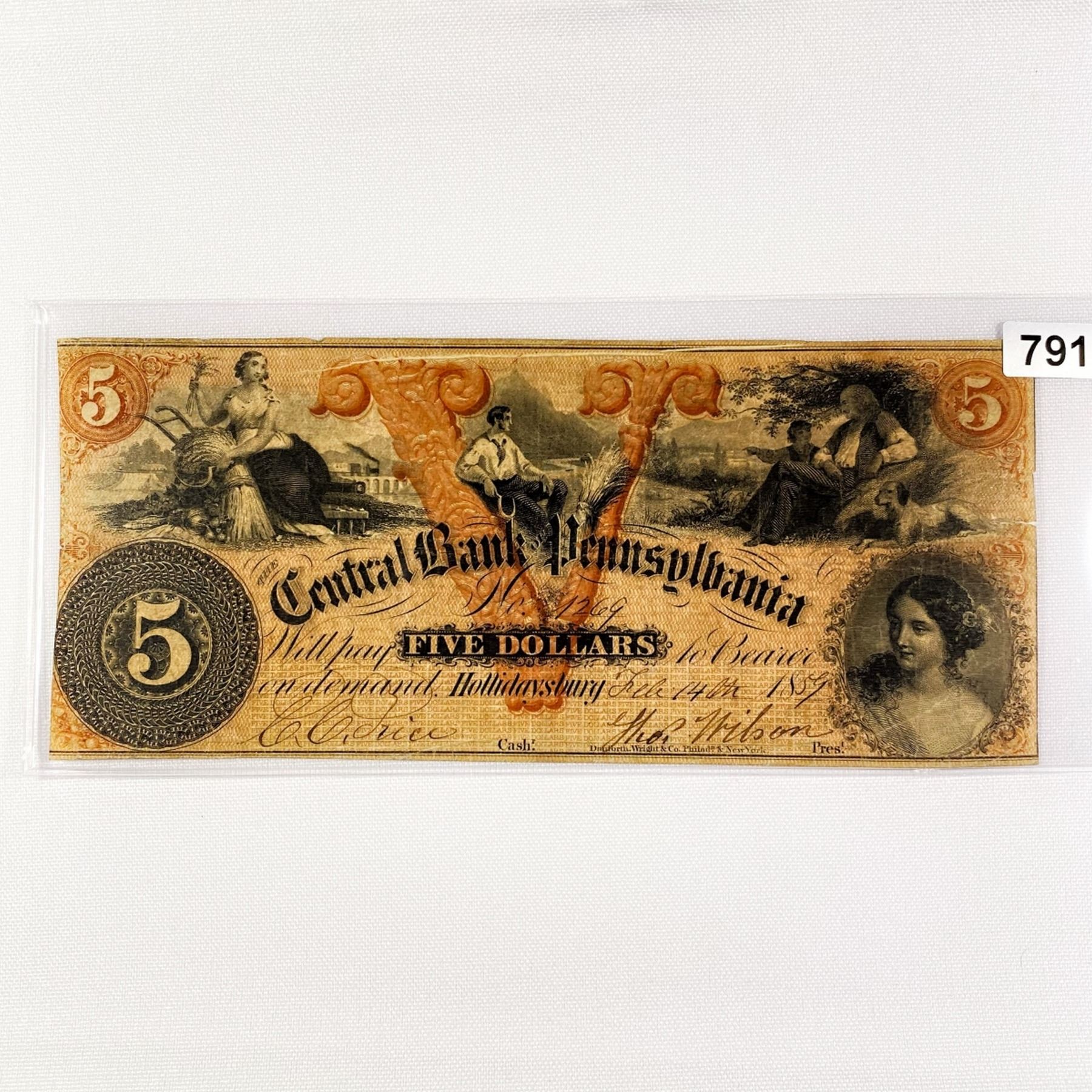 1859 $5 Central Bank of Hollidaysbury PA Note