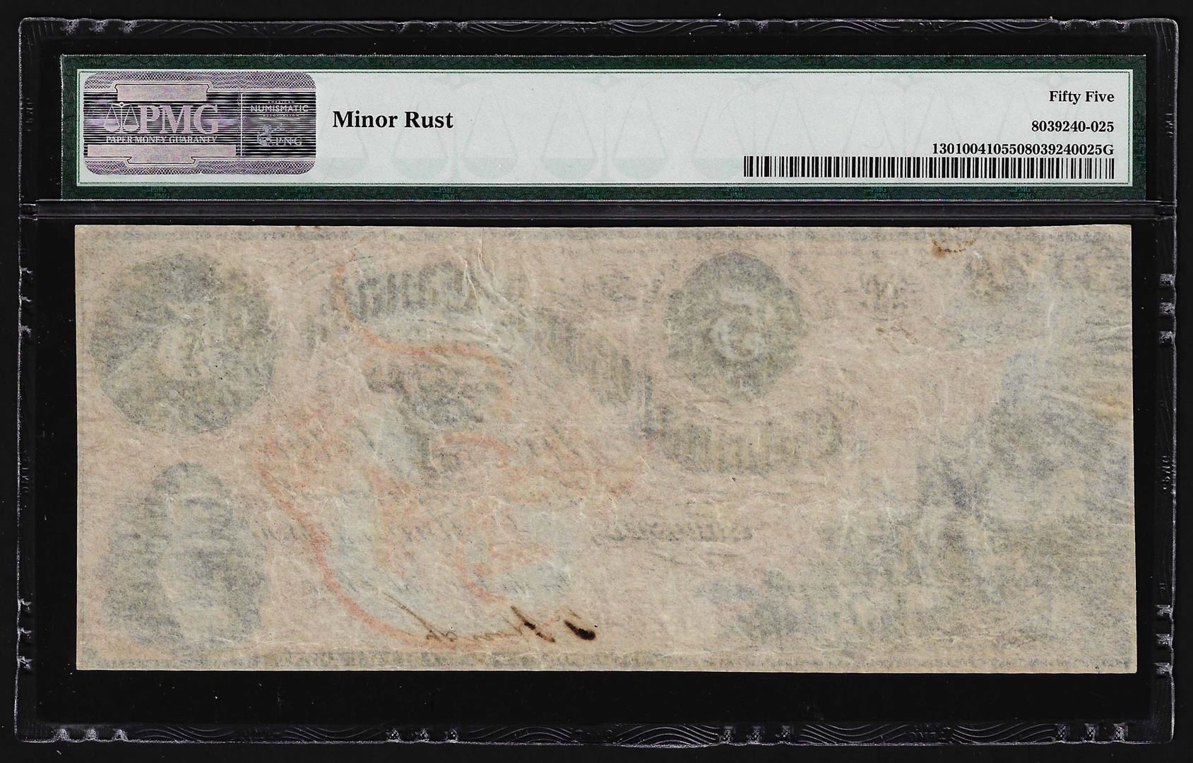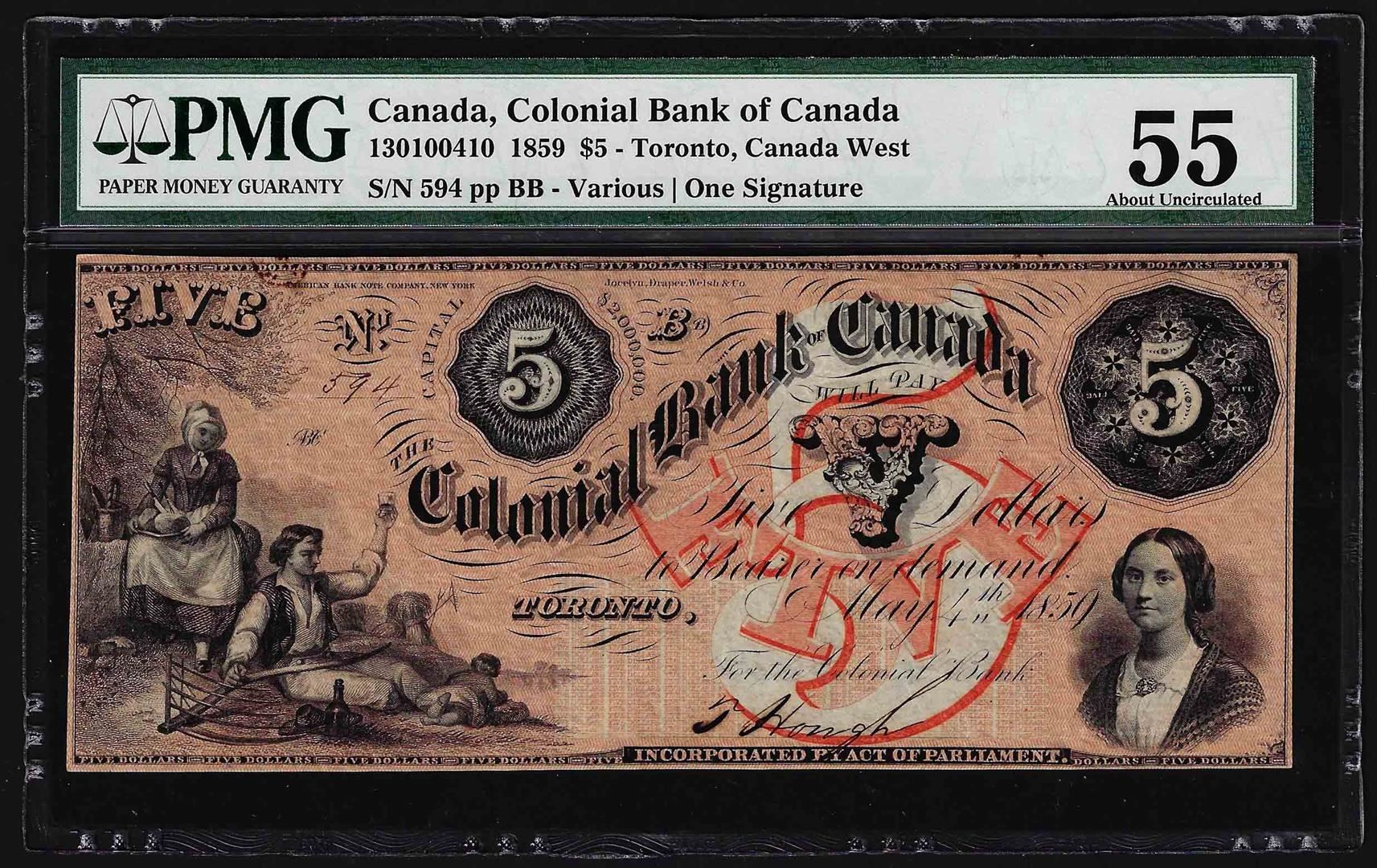 One 1859 $5 Colonial Bank of Canada Note PMG About Uncirculated 55. PMG Certified.