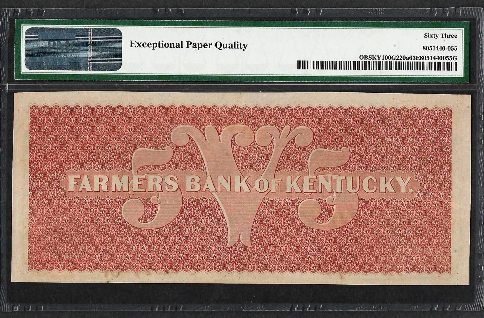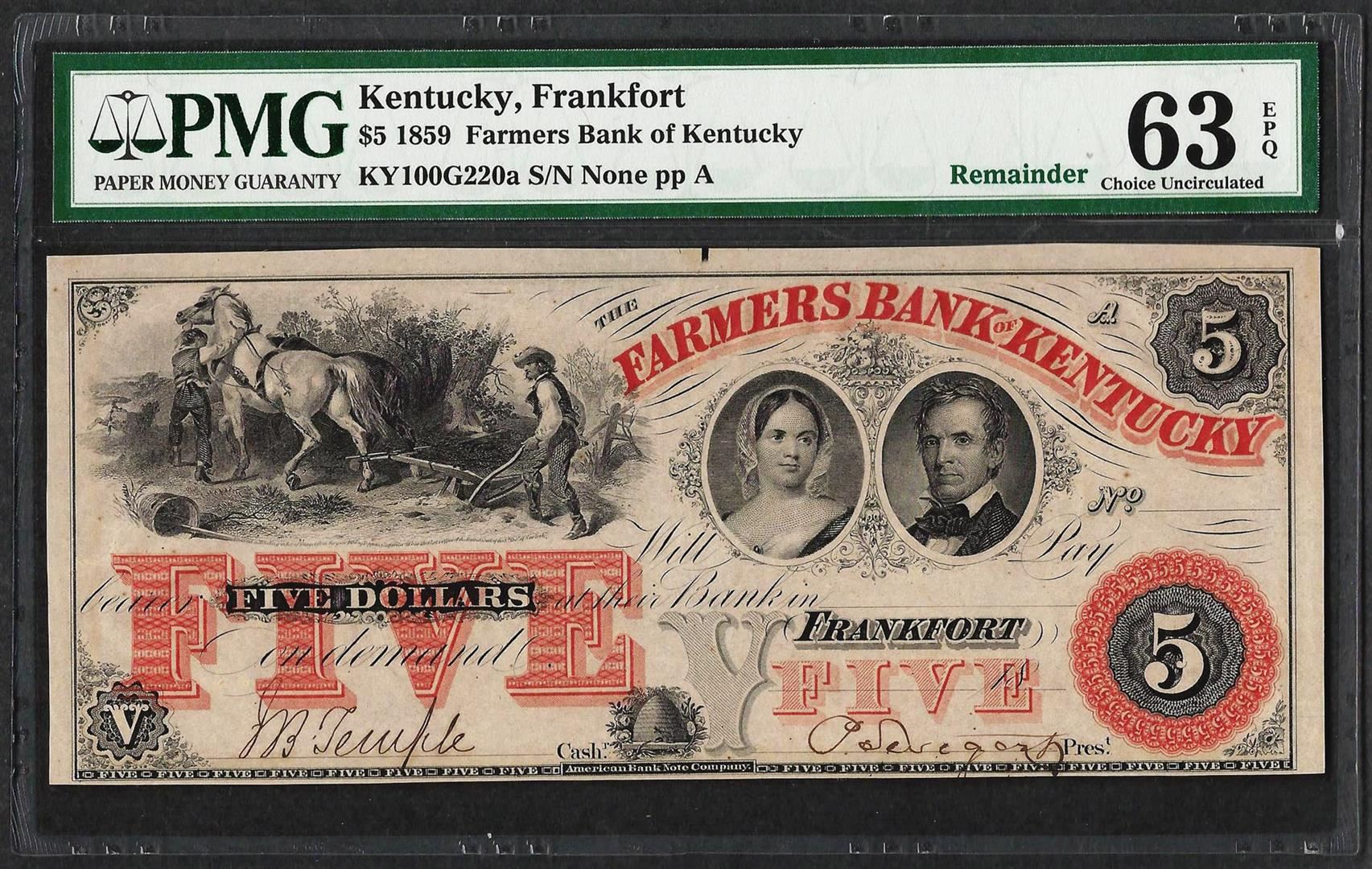 One 1859 $5 Farmers Bank of Kentucky Obsolete Note PMG Choice Uncirculated 63EPQ. PMG Certified.