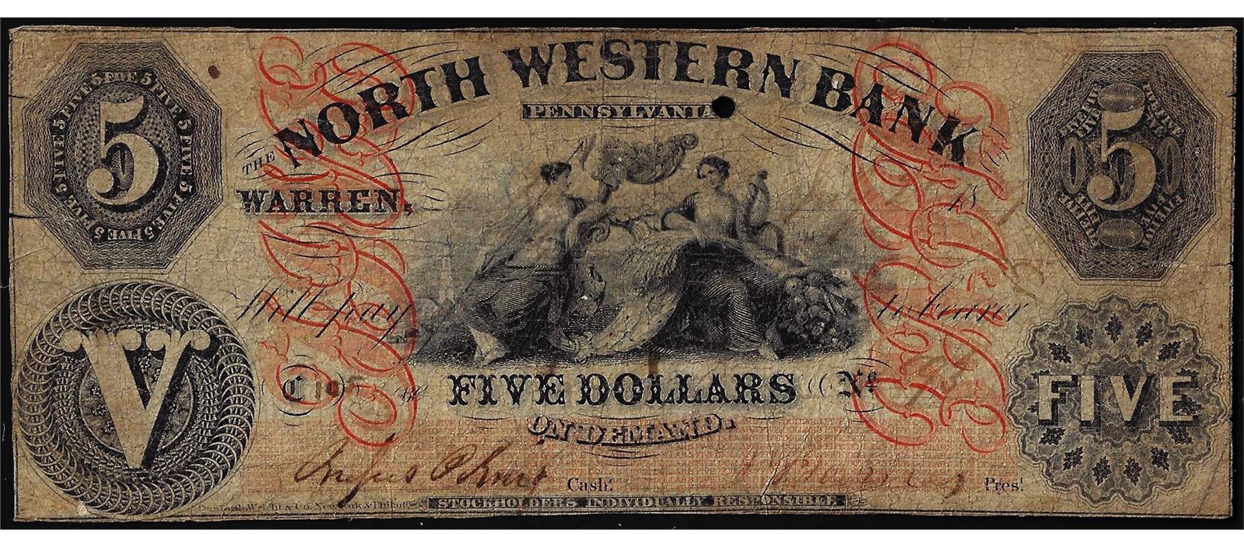 One 1859 $5 North Western Bank Warren, PA Obsolete Currency Note.
