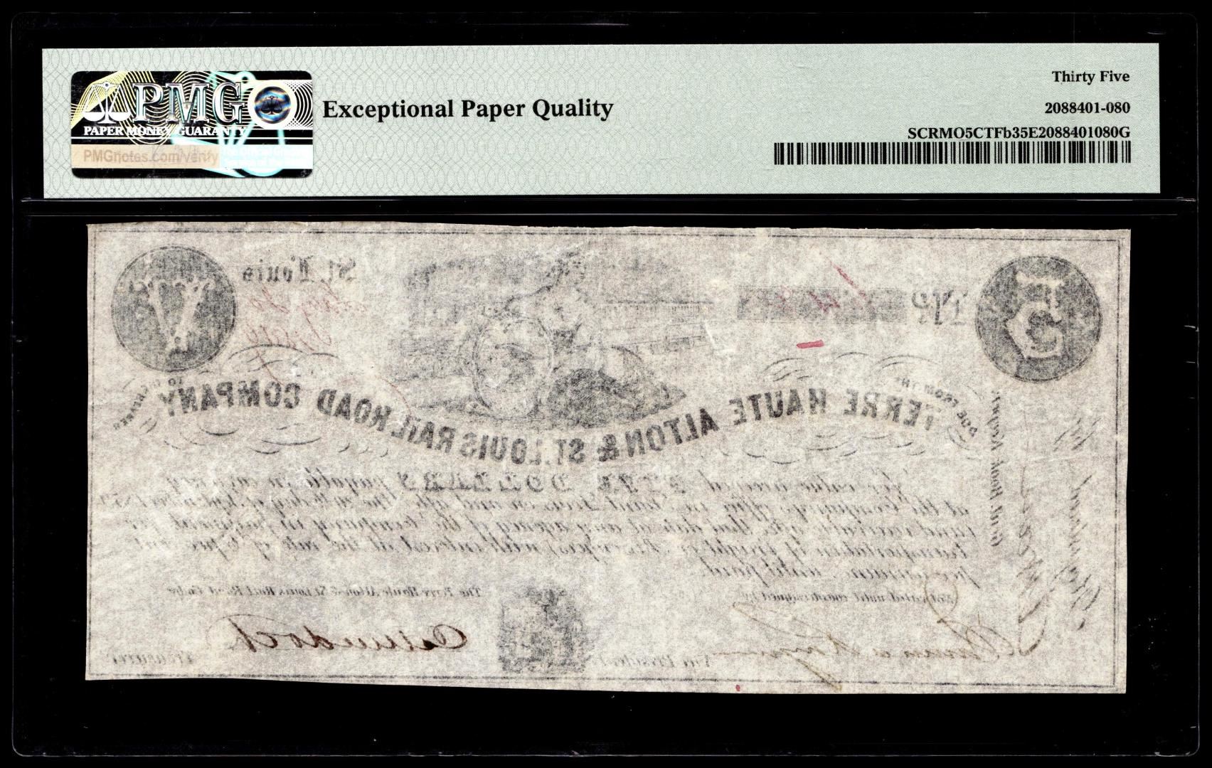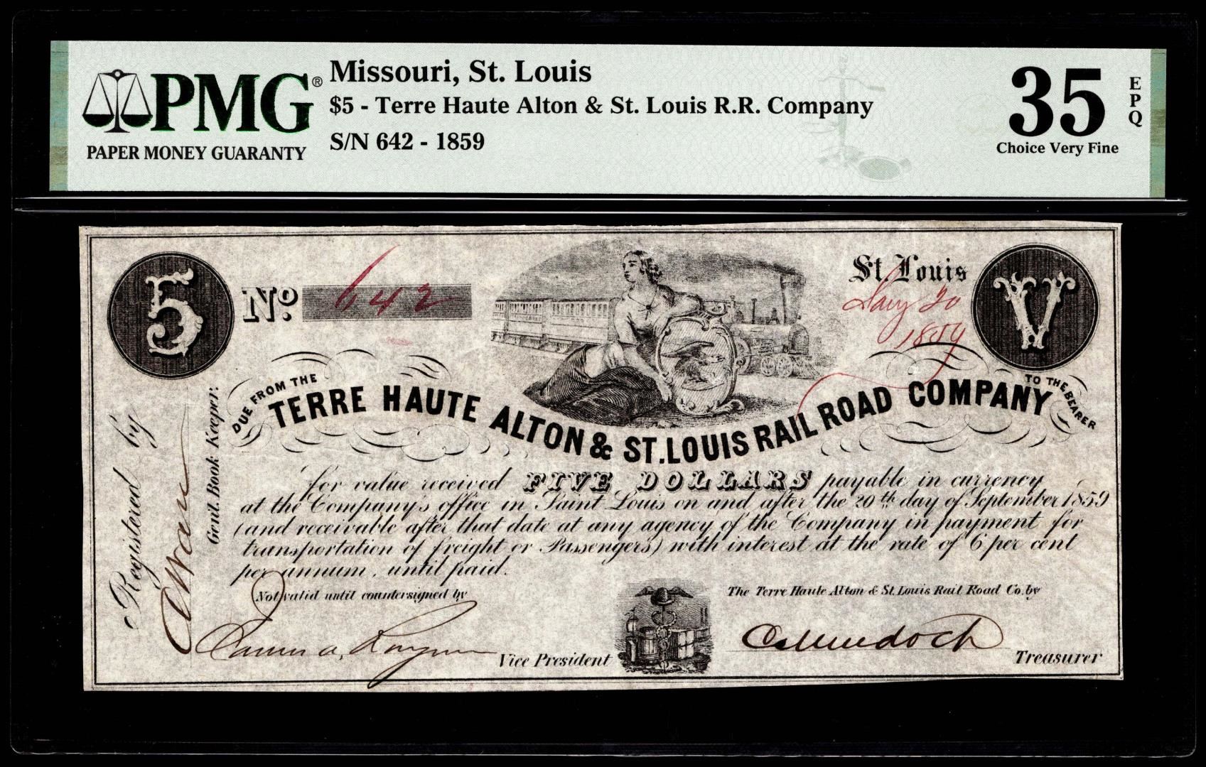 1859 $5 Terre Haute Alton & St. Louis Railroad Co. MI Note PMG Choice Very Fine 35EPQ