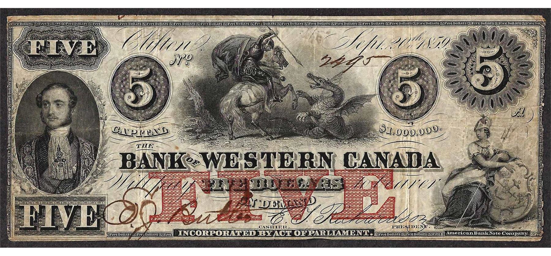 1859 $5 The Bank of Western Canada Dragon Obsolete Note- Pinholes