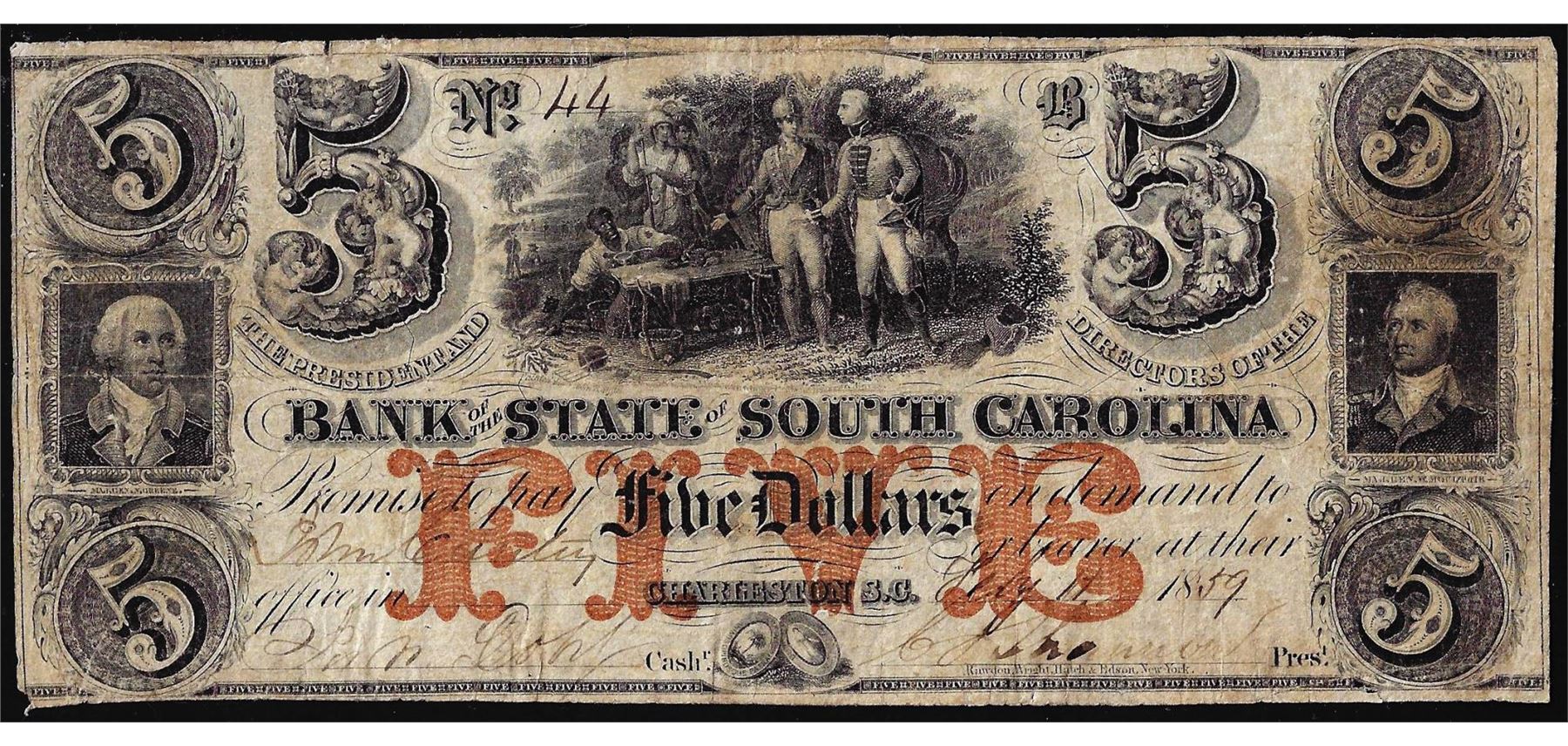 One 1859 $5 The State Bank of South Carolina Charleston, SC Obsolete Bank Note.
