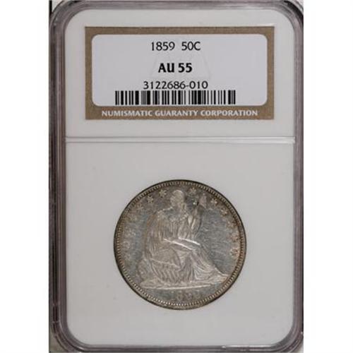 <B>1859 50C AU55 NGC.</B></I> . NGC Census: (17/70). PCGS Population (13/51). Mintage: 747,200. Numismedia Wsl. Price for NGC/PCGS coin in AU55: $250. (#6296)<BR><BR><B>Coin Engraver:</B> Christian Gobrecht<BR><BR><b>Shipping:</b> Coins & Currency (<a target="_blank" href="http://www.heritageauctions.com/common/shipping.php">view shipping information</a>)
