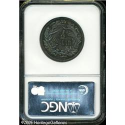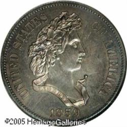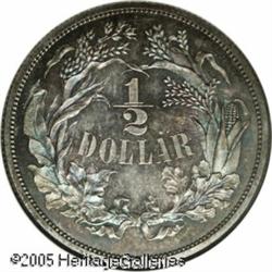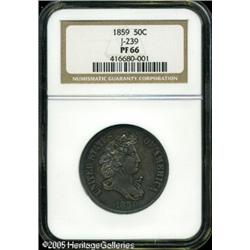 <B>1859 50C Half Dollar, Judd-239, Pollock-295, R.4, PR66 NGC.</B></I> Longacre's "French Head" design for the Half Dollar that features a bust of Liberty facing right, draped with a ribbon inscribed LIBERTY with a wide wreath of oak and vine on her head. The reverse has 1/2 DOLLAR in the center and is surrounded by a wreath of cotton, tobacco, corn, sugar cane, wheat, and oak. Struck in silver with a reeded edge. Modestly reflective, the surfaces have taken on deep accents of steel-blue and reddish-golden in the protected areas. Fully defined throughout, this is the finest J-239 we have handled since we began keeping records. Lot:9829