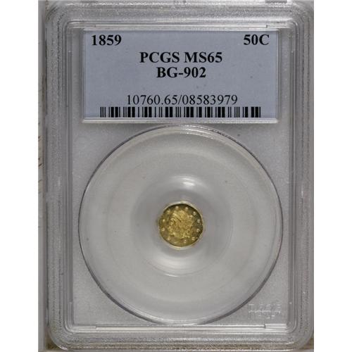 <B>1859<50C> Liberty Octagonal 50 Cents, BG-902, Low R.4, MS65 PCGS.</B></I> Hints of orange enliven the highly lustrous surfaces of this yellow-gold example. A nicely struck and appealing Gem. Population: 9 in 65, 0 finer (9/06).