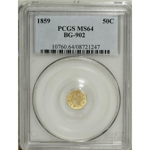 <B>1859 50C Liberty Octagonal 50 Cents, BG-902, Low R.4, MS64 PCGS.</B></I> A lustrous example of this very scarce variety that has traces of olive-gold on the yellow-gold surfaces. Highly appealing. Population: 24 in 64, 9 finer (10/06).<BR><BR><b>Shipping:</b> Coin/Currency (<a target="_blank" href="http://www.heritageauctions.com/common/shipping.php">view shipping information</a>)
