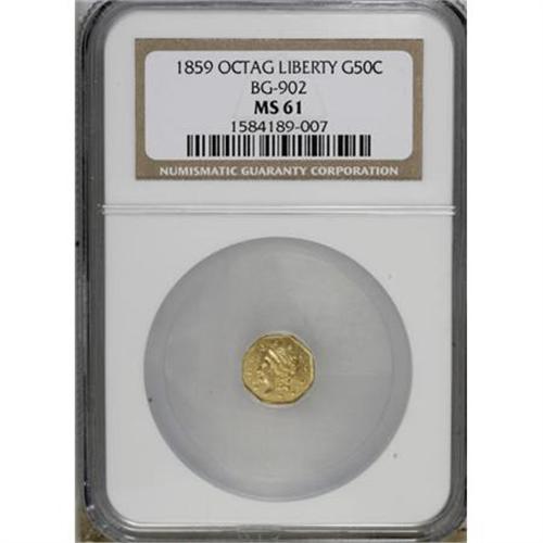 <B>1859 50C Liberty Octagonal 50 Cents, BG-902, Low R.4, MS61 NGC.</B></I> NGC Census: (1/11). PCGS Population (4/89). (#10760)<BR><BR><b>Shipping:</b> Coins & Currency (<a target="_blank" href="http://www.heritageauctions.com/common/shipping.php">view shipping information</a>)