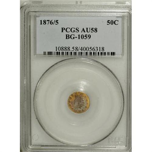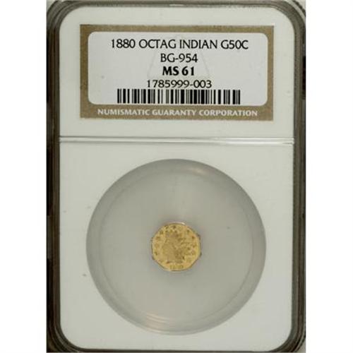 <B>1859 50C Liberty Octagonal 50 Cents, BG-902, Low R.4, MS61 NGC,</B></I> unlisted lapped reverse die state, straw-gold, a couple of lintmarks;<B> 1880 Indian Octagonal 50 Cents, BG-954, Low R.4, MS61 NGC, </B></I>khaki-gold toning, faint marks east of the fraction; and an <B>1876/5 Indian Round 50 Cents, BG-1059, R.4, AU58 PCGS, </B></I>colorful rose-red, sky-blue, and apricot patina, a few faint hairlines.<BR><BR><b>Shipping:</b> Coins & Currency (<a target="_blank" href="http://www.heritageauctions.com/common/shipping.php">view shipping information</a>)