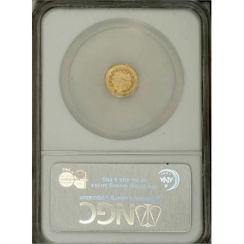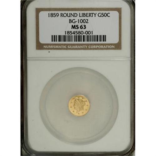 <B>1859 50C Liberty Round 50 Cents, BG-1002, High R.4, MS63 NGC.</B></I> Bright yellow-gold surfaces display reasonably well struck design elements, and a few minute reverse marks. The obverse exhibits a couple of die cracks. Census: 2 in 63, 7 finer (12/07).<BR><BR><b>Shipping:</b> Coins & Currency (<a target="_blank" href="http://www.heritageauctions.com/common/shipping.php">view shipping information</a>)