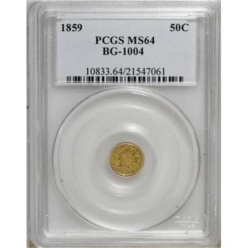 <B>1859 50C Liberty Round 50 Cents, BG-1004, Low R.6, MS64 PCGS.</B></I> A green-gold representative of this challenging Period Two variety. Die lapping has weakened the AR in DOLLAR, but the strike is exemplary. Population: 4 in 64, 0 finer (3/08).<BR><BR><b>Shipping:</b> Coins & Currency (<a target="_blank" href="http://www.heritageauctions.com/common/shipping.php">view shipping information</a>)